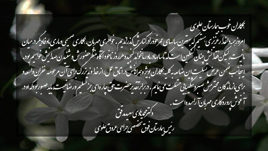 اخبار 30 مرداد 1400 بازدید: 676 امتیاز: ( 1 Rating ) مدافع سلامت بیمارستان علوی آسمانی شد امتیاز کاربران لطفا رای دهید رای 1 رای 2 رای 3 رای 4 رای 5 سرکار خانم زهرا رفیعی، مدافع سلامت و همکار گرانقدر اتاق عمل بیمارستان علوی به علت ابتلا به بیماری کرونا جان به جان آفرین تسلیم کرد متن تسلیت ریاست محترم بیمارستان علوی قبلی بعدی